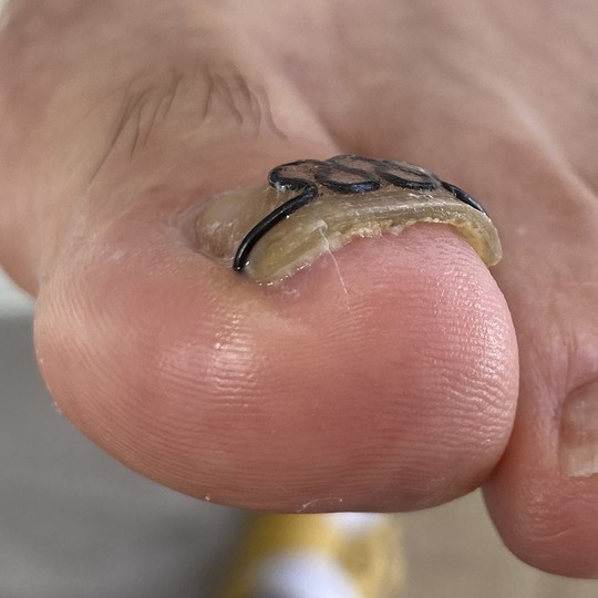 爪回りの古い角質を掃除し、食い込みにしっかり装具を付けました
