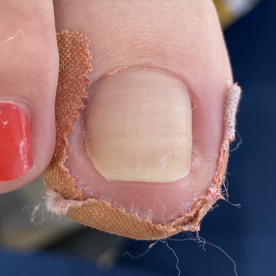 また、テーピング法は周りのお肉を引き下げて圧迫を取り除いているにすぎず、爪に対し何のアプローチもしていないため、根本改善には結びつきません。