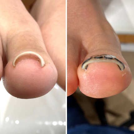 装具がついている写真は一見痛そうに見えますが、実際は爪が広がり、肉への圧迫が取り除かれることで痛みを感じなくなる方が多いです。
