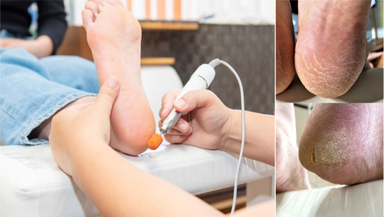 角質の状況に応じて、フットケア専用の器具(コーンカッターなど)とフットケアマシンを使い、不要な角質をやさしく削って落としていきます。